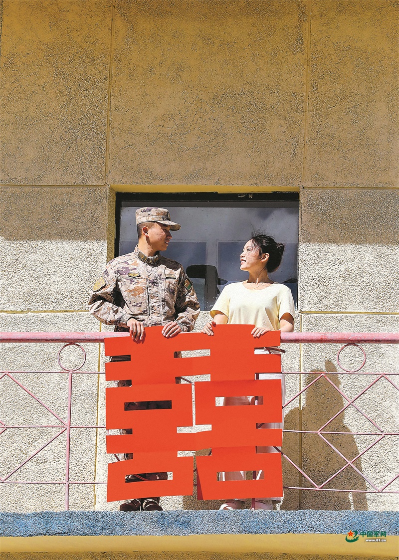 在海拔4500米的西藏阿里军分区某边防营宿舍,二级上士马波的柜门内侧贴着一张照片——画面中的哨楼栏杆上贴着红“囍”字,他和妻子张远琴并肩而立。每天整理内务时,马波都会忍不住看一眼这张照片,心中满是温暖。